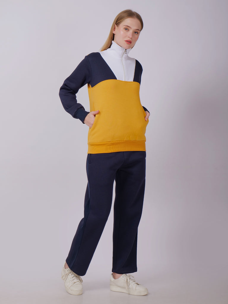 Upgrade your everyday wardrobe with this stylish and versatile two-piece co-ord set. Featuring a dynamic mix of navy, mustard, and white, this ensemble blends sporty charm with cozy comfort, making it perfect for casual outings, lounging, or an effortlessly chic athleisure look.