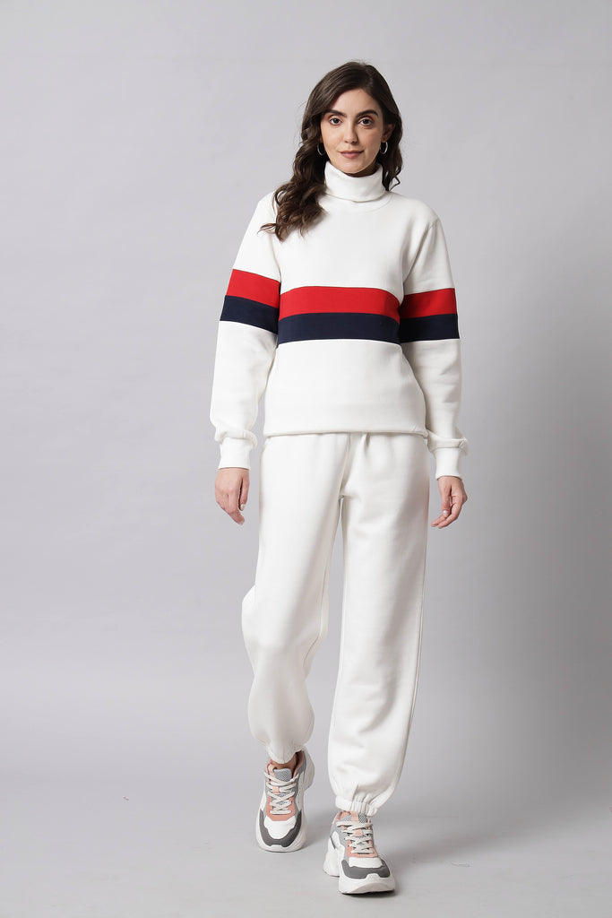Step into bold sophistication and ultimate comfort with Prrodality's red, navy, and white striped co-ord set. This dynamic combination of a high-neck sweatshirt and relaxed joggers is perfect for effortless athleisure looks.