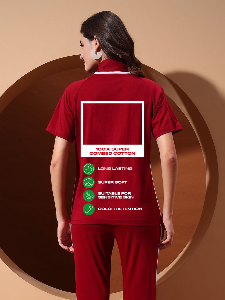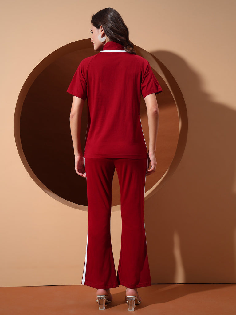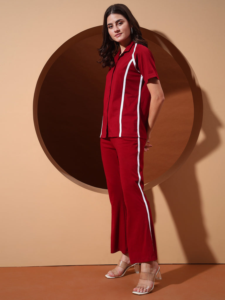 A bold, clean silhouette for days when you want to serve looks and comfort. This slounge set brings together the structure of a buttoned shirt with the flow of flared pants. Contrast white piping runs through the design for a sporty, tailored finish.