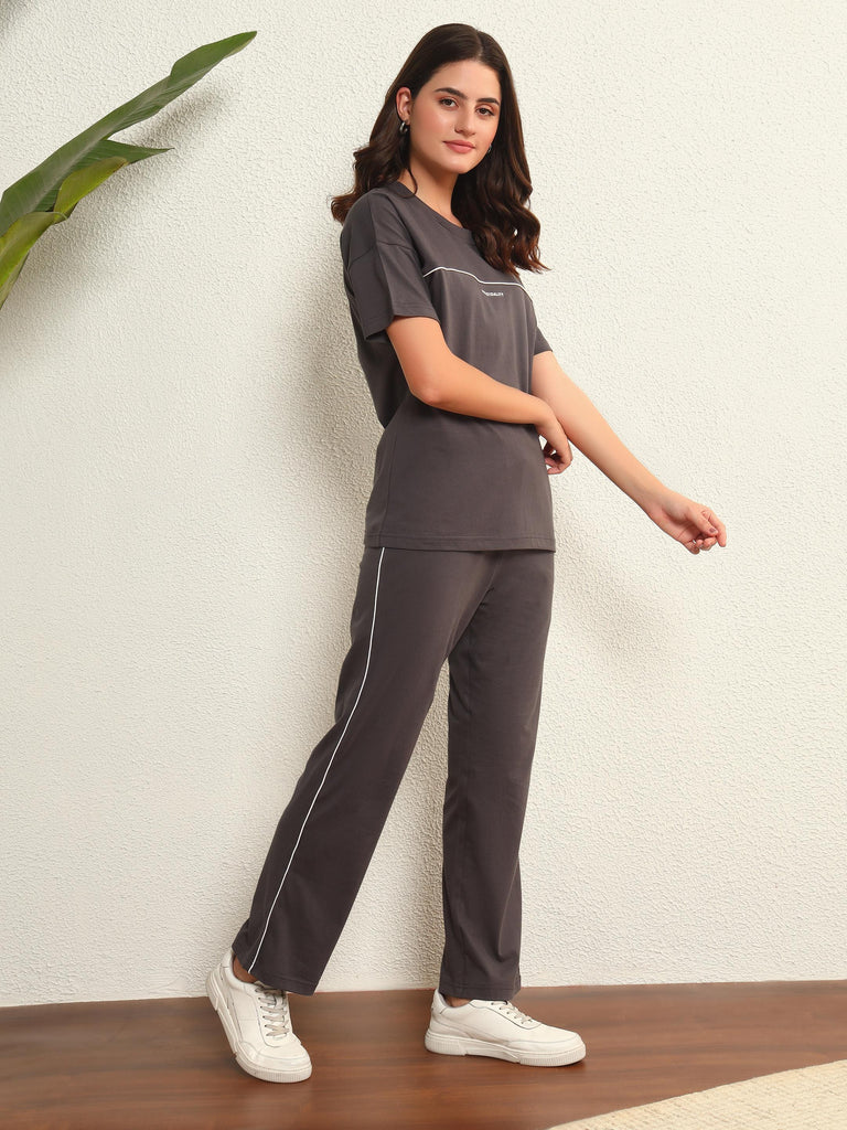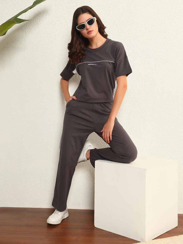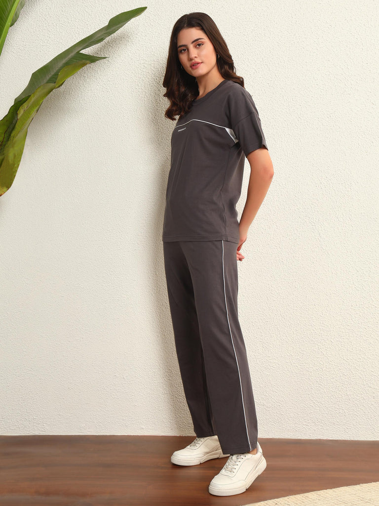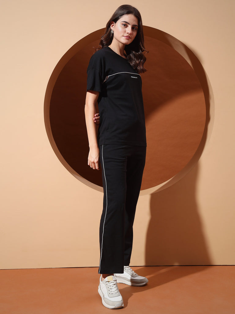 Minimalist meets mood in this effortless co-ord made for movement, mood, and maximum comfort. Crafted from super combed cotton, the tee features piping and panel detailing, while the straight-fit pants complete the set with classic ease and subtle branding.