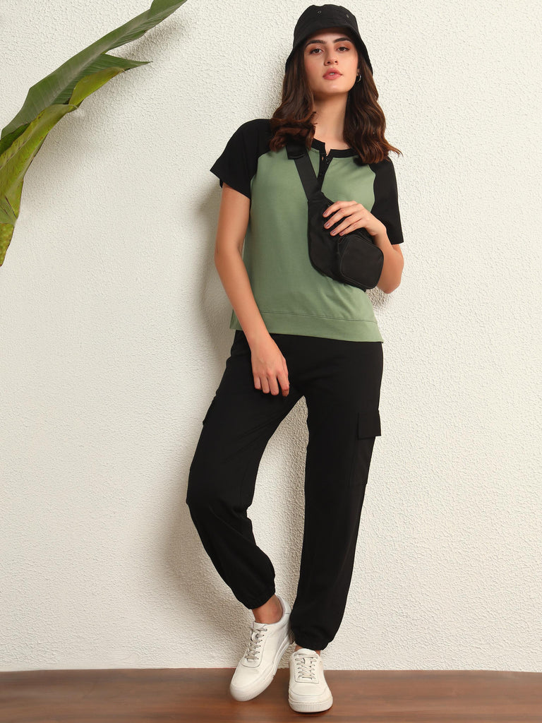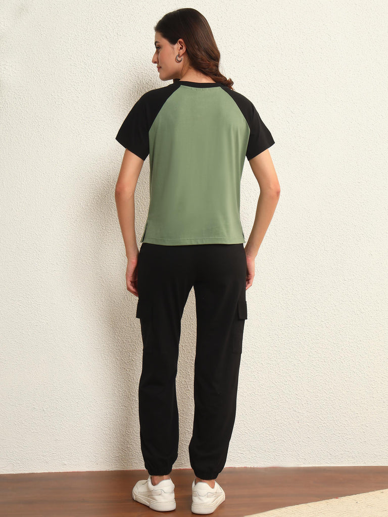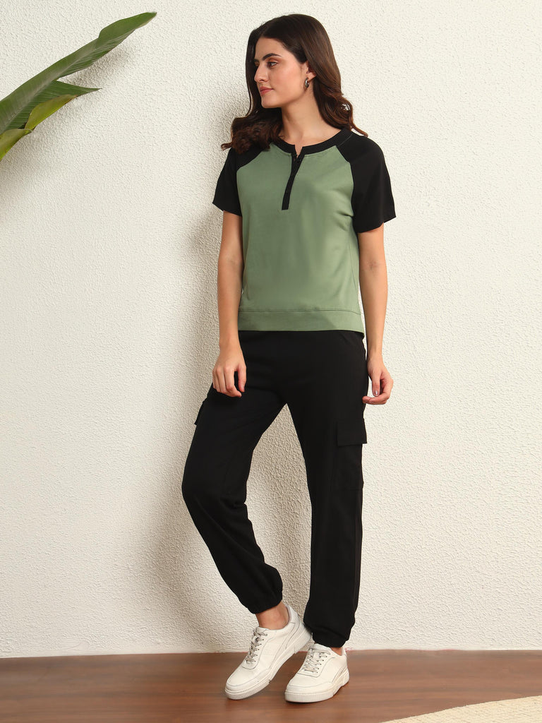 Where comfort meets edge โ this two-tone co-ord set brings in sporty street vibes with a soft cotton base. The raglan T-shirt features a partial button placket and contrast sleeves, while the cargo joggers pack utility and ease with every step.
