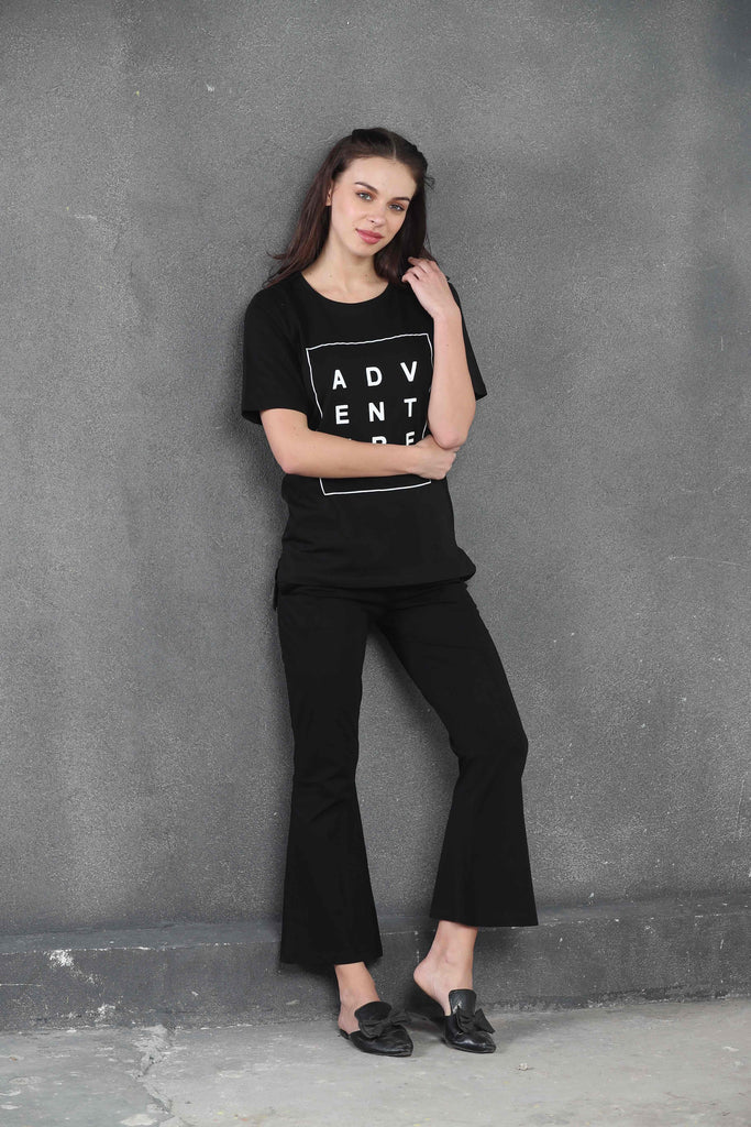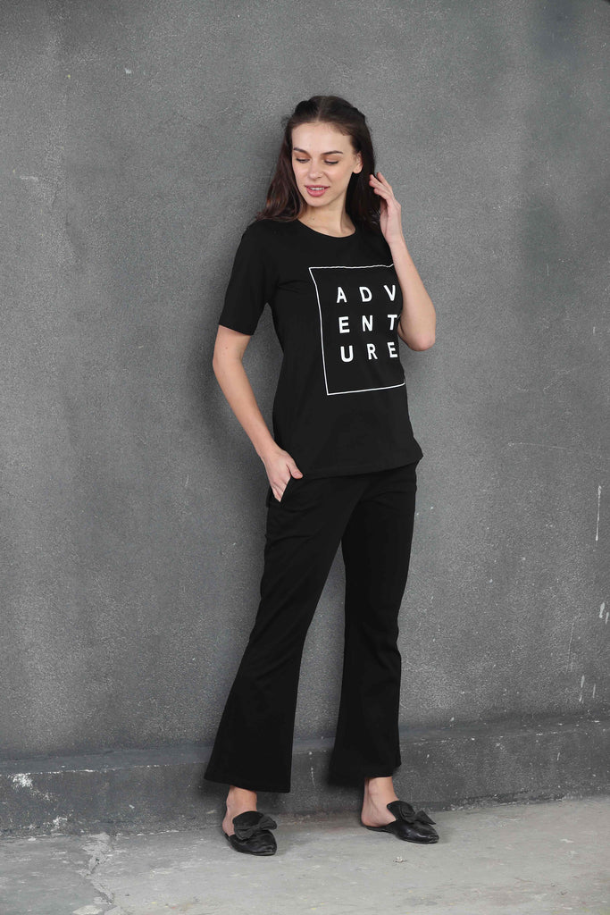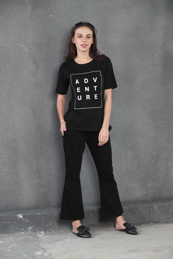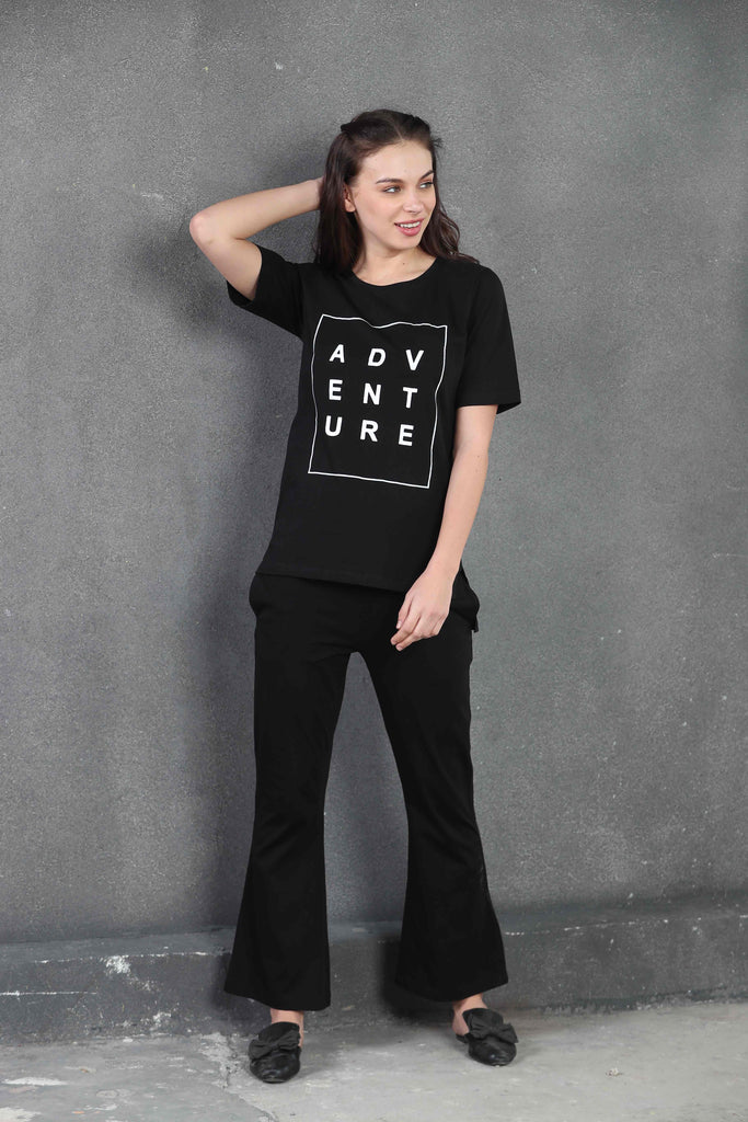 Our Black 'ADVENTURE' Print Co-Ord Set features a long t-shirt paired with flare bottoms. Designed for effortless style and ease, this set is perfect for those who love to mix comfort with a touch of adventure.