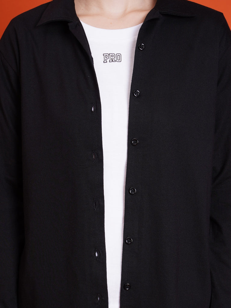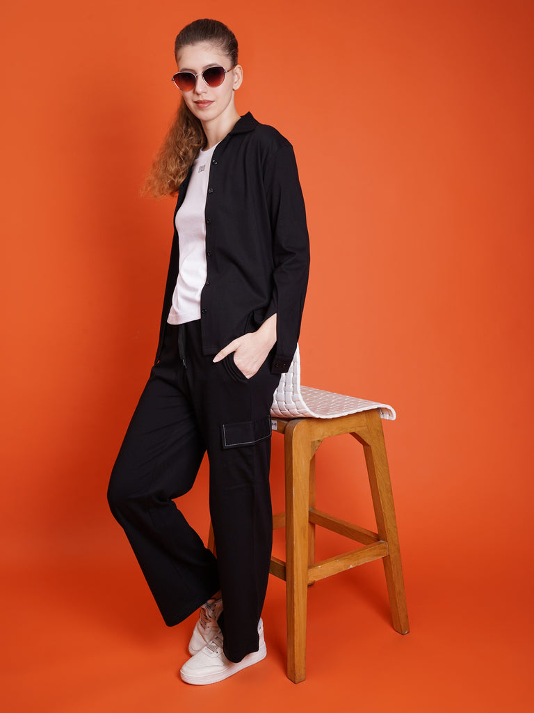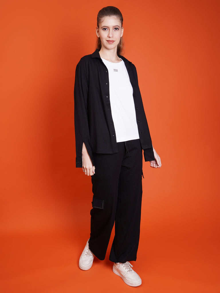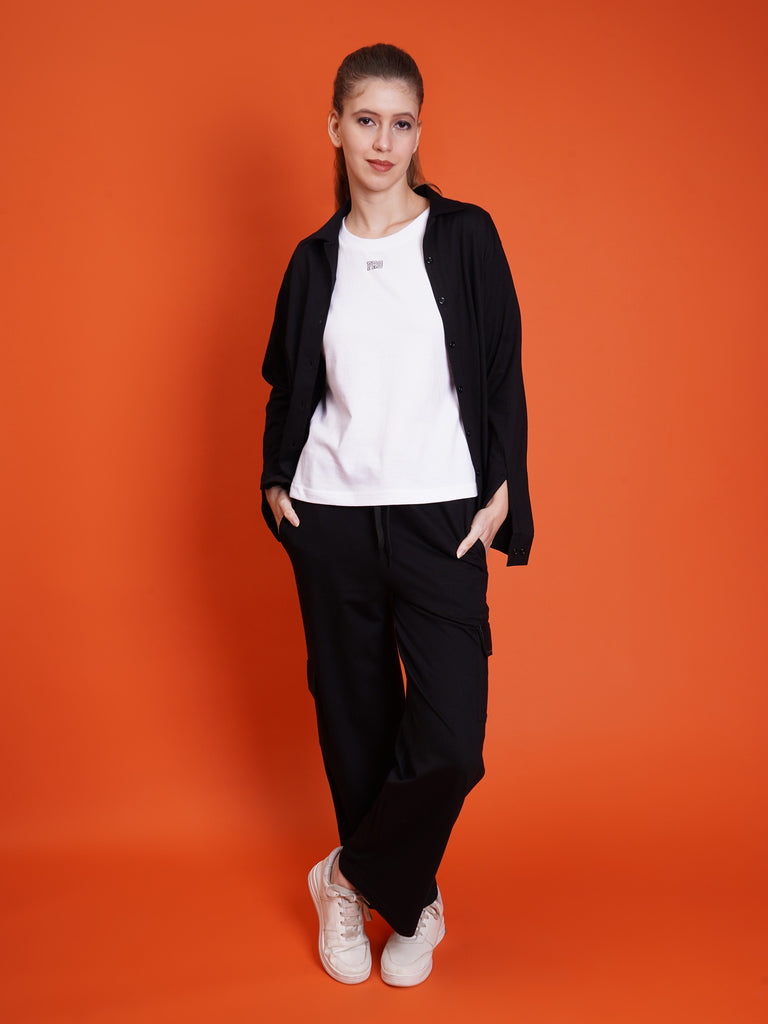 Discover effortless style with our 3-piece set, featuring a sleek black button-down full-sleeve shirt, a crisp white half-sleeve tee, and loose straight bottoms with functional flap pockets. This versatile combination is designed for every occasion—dress it up for a casual brunch or keep it laid-back for a day at home. With its easygoing fit and stylish details, this set is your go-to choice for looking polished and feeling comfortable, no matter where your day takes you!