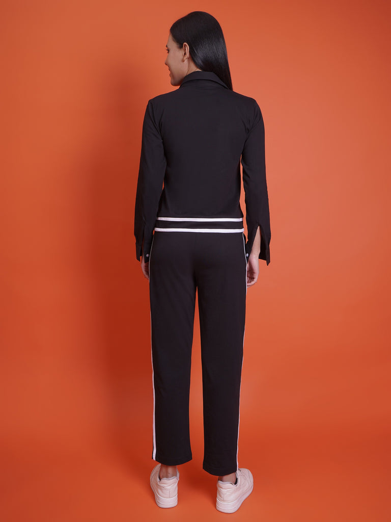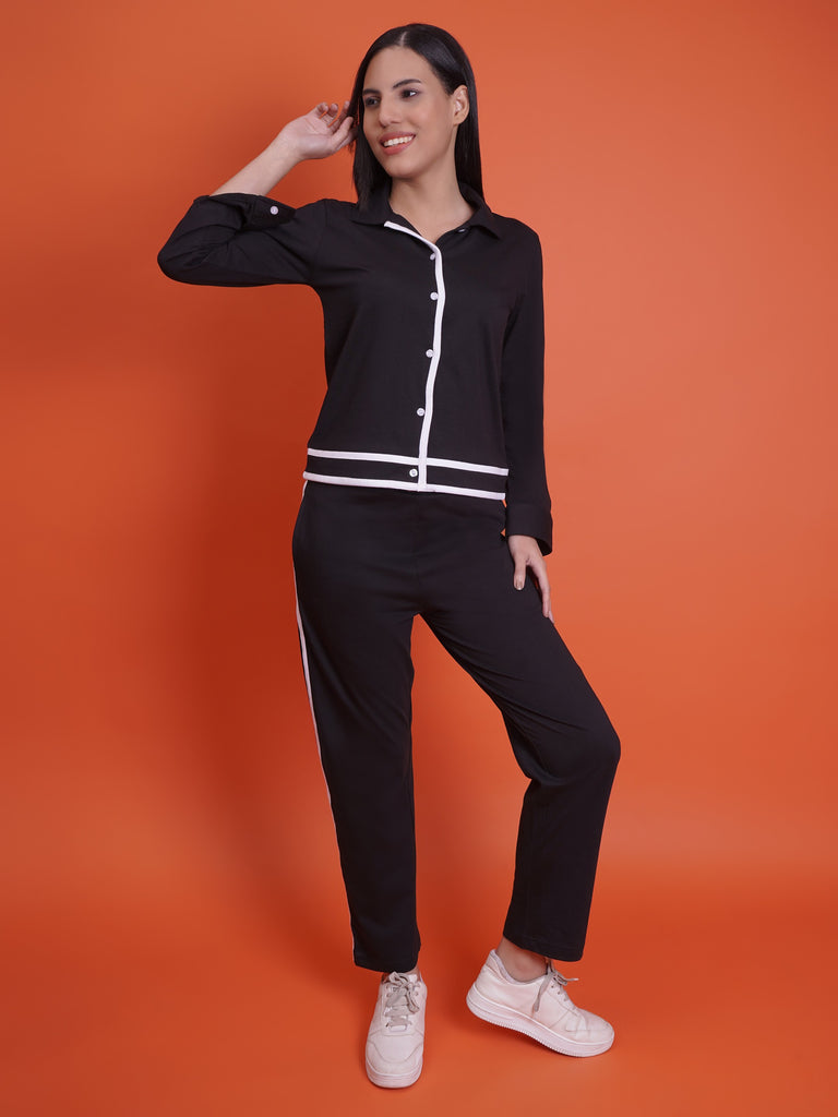 Sleek, stylish, and effortlessly versatile. This black co-ord set with front buttons and subtle stripes is your go-anywhere, do-anything outfit. Minimal yet elegant, it's perfect for lounging in style or stepping out with confidence. The perfect blend of comfort and class!