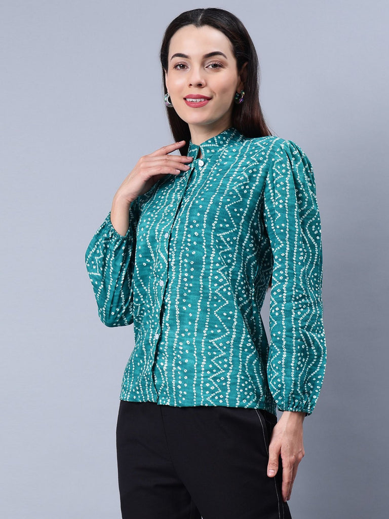 Teal Tribal Print Mandarin Collar Shirt – Smart Casual Fit